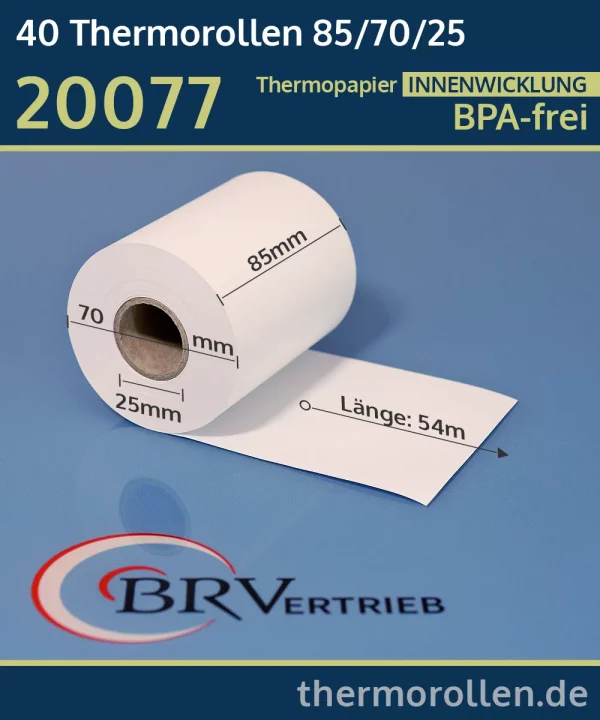 Unsere BPA-freien Thermorollen mit einer Breite von 85mm und einem Durchmesser von ca. 70mm besitzen eine Lauflänge von ca. 54m und können daher synonym auch als Thermorollen 85 / 54m / 25 bezeichnet werden. Die Angabe 25mm bezieht sich auf den Lochdurchmesser des Rollenkerns.